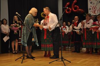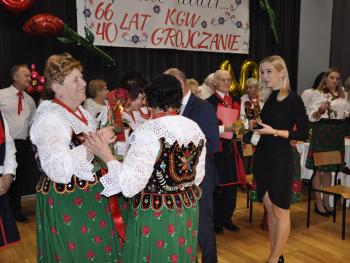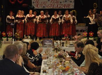 Główne uroczystości odbyły się w grojeckim Domu Ludowym, gdzie pojawili się zaproszeni goście. Życzenia i gratulacje dla wszystkich członków zespołu „Grojczanie” oraz Pań z KGW na ręce przewodniczącej KGW - Marii Śliwki złożył Wójt Gminy Oświęcim Mirosław Smolarek, który na jubileuszowych obchodach pojawił się wraz z małżonką Beatą.